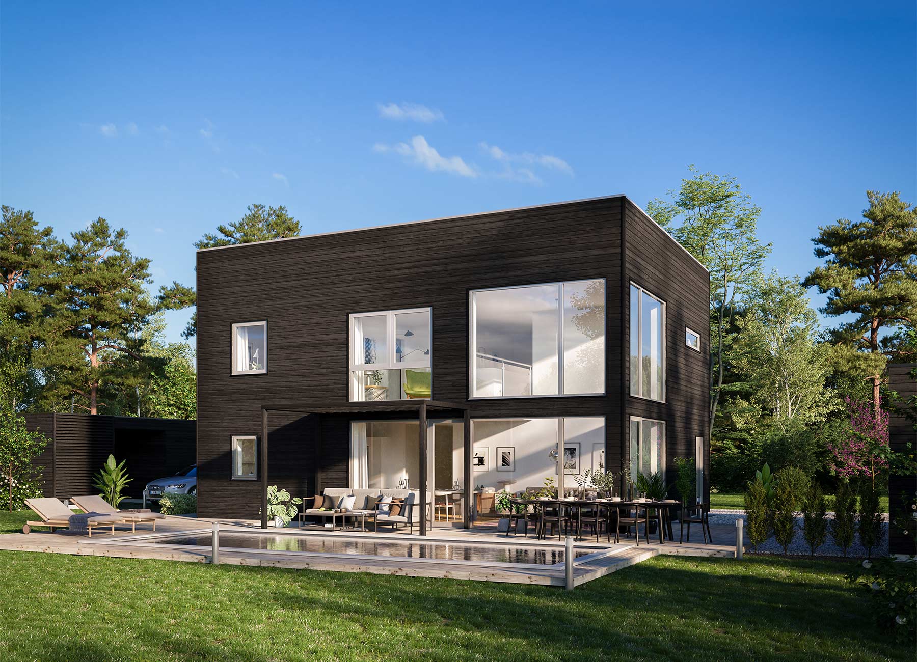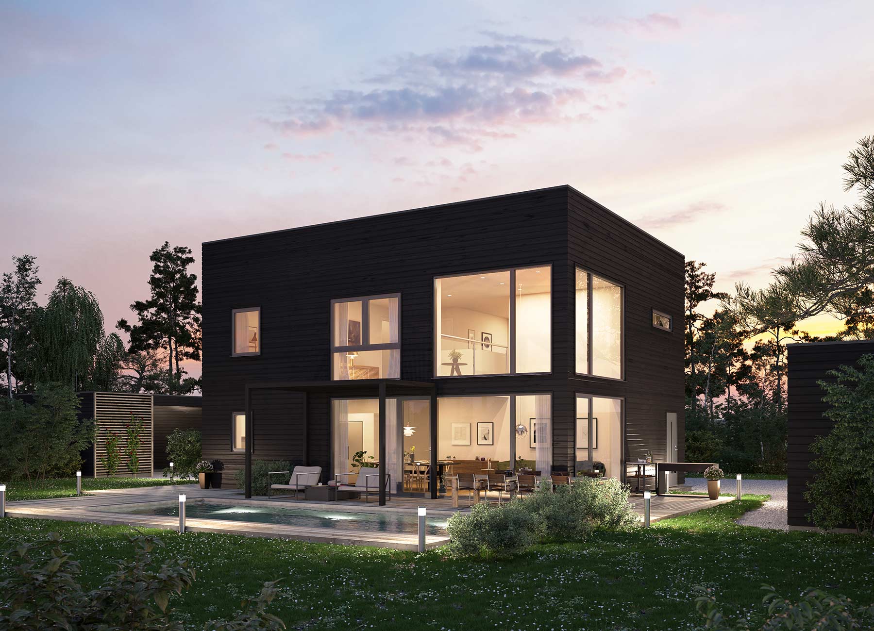 Nova 3 är huset som verkligen sticker ut i mängden. Med sin häftiga kubiska form och stora fönsterpartier blir både utsidan och insidan en fröjd för ögat. Utformningen är perfekt om man vill ha en framsida fri från insyn och en storslagen utsikt över baksidan.