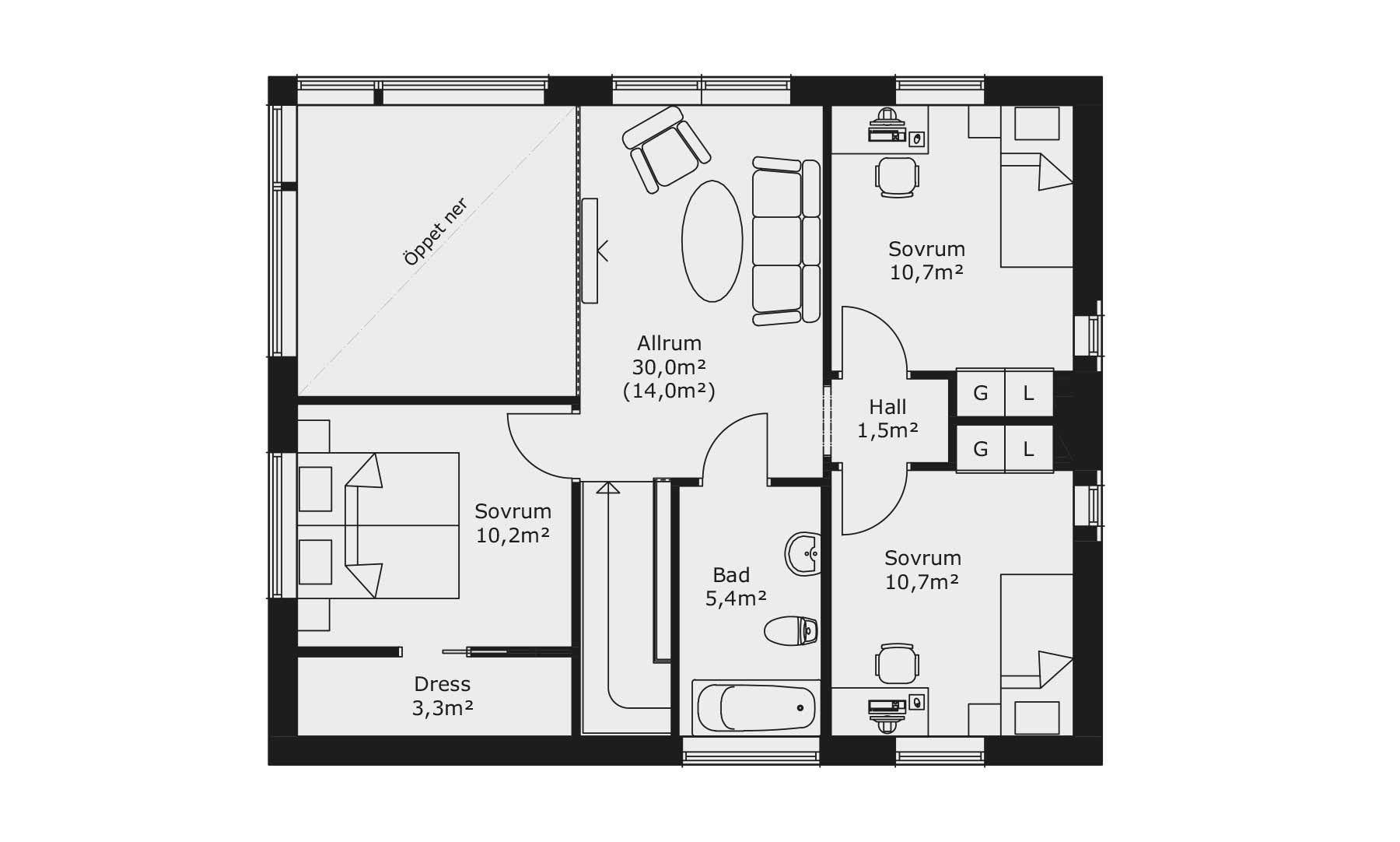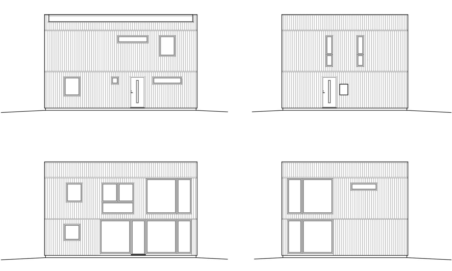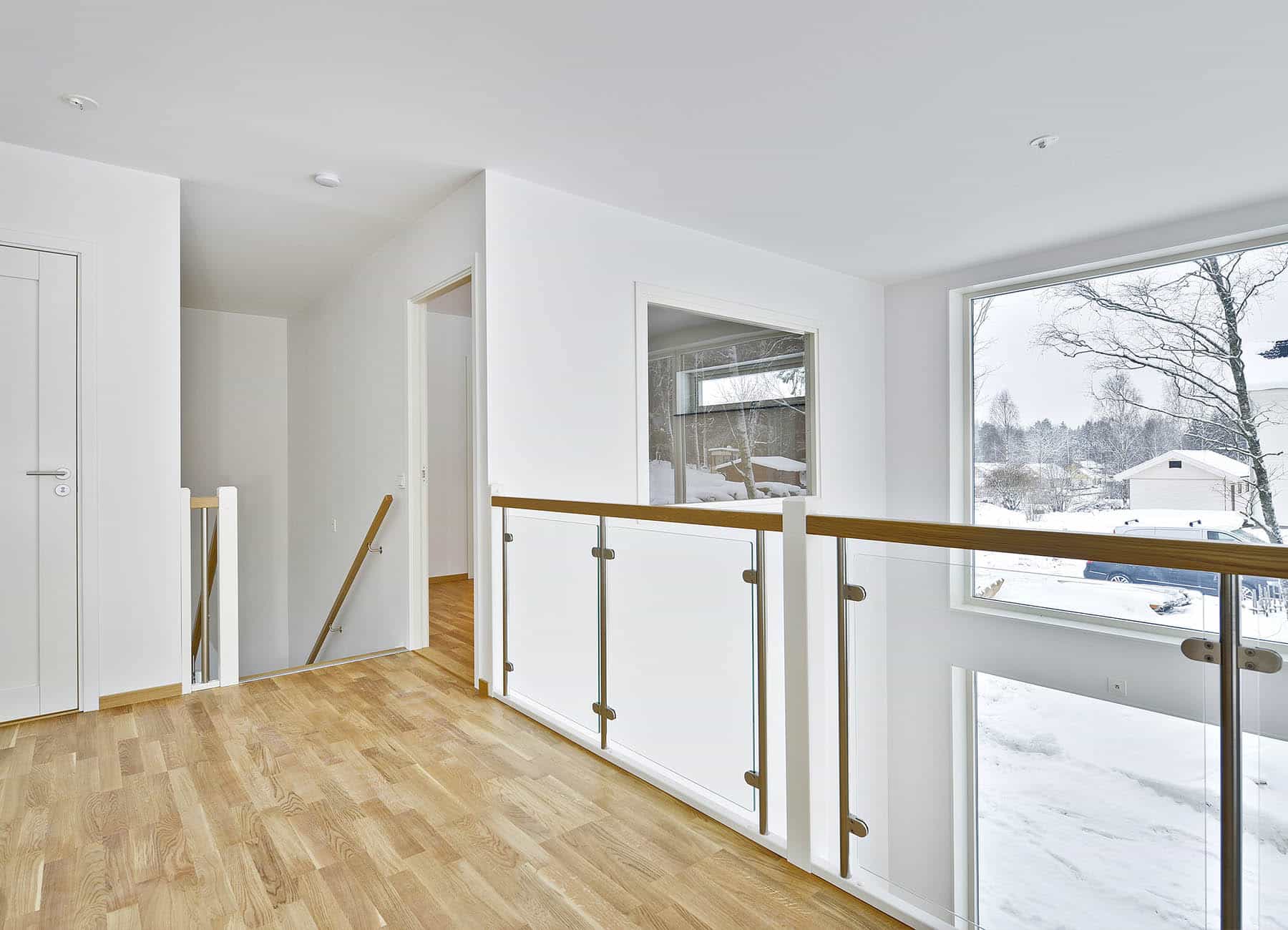 Huset har hela fyra sovrum, ett på nedervåningen och tre på övervåningen. Om man inte behöver så många sovrum passar två av de mindre sovrummen på övervåningen perfekt som hemmakontor med bra ljusinsläpp via stora fönster och gott om plats för både skrivbord och förvaring. I föräldrasovrummet på övervåningen finns det möjlighet att sätta in ett fönster mot den öppna delen från vardagsrummet nedanför som har öppet helt till taket på våning två.