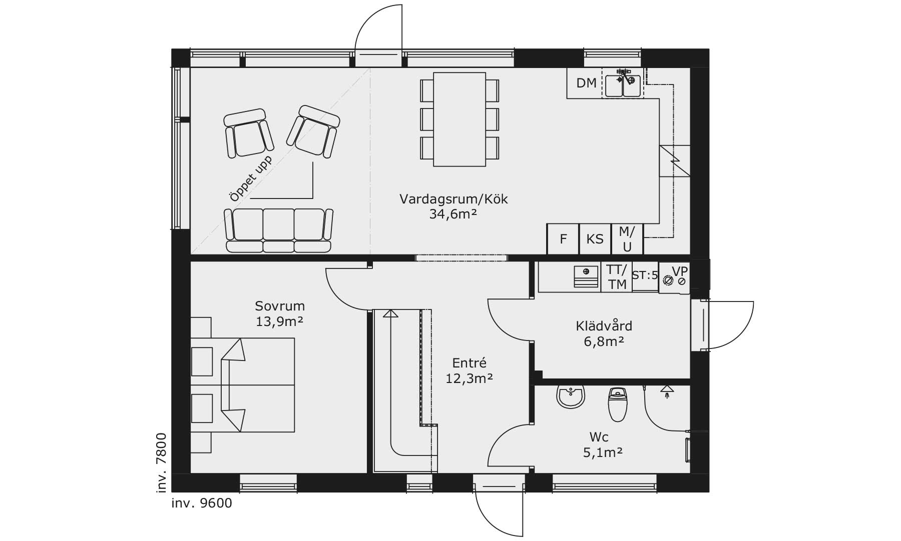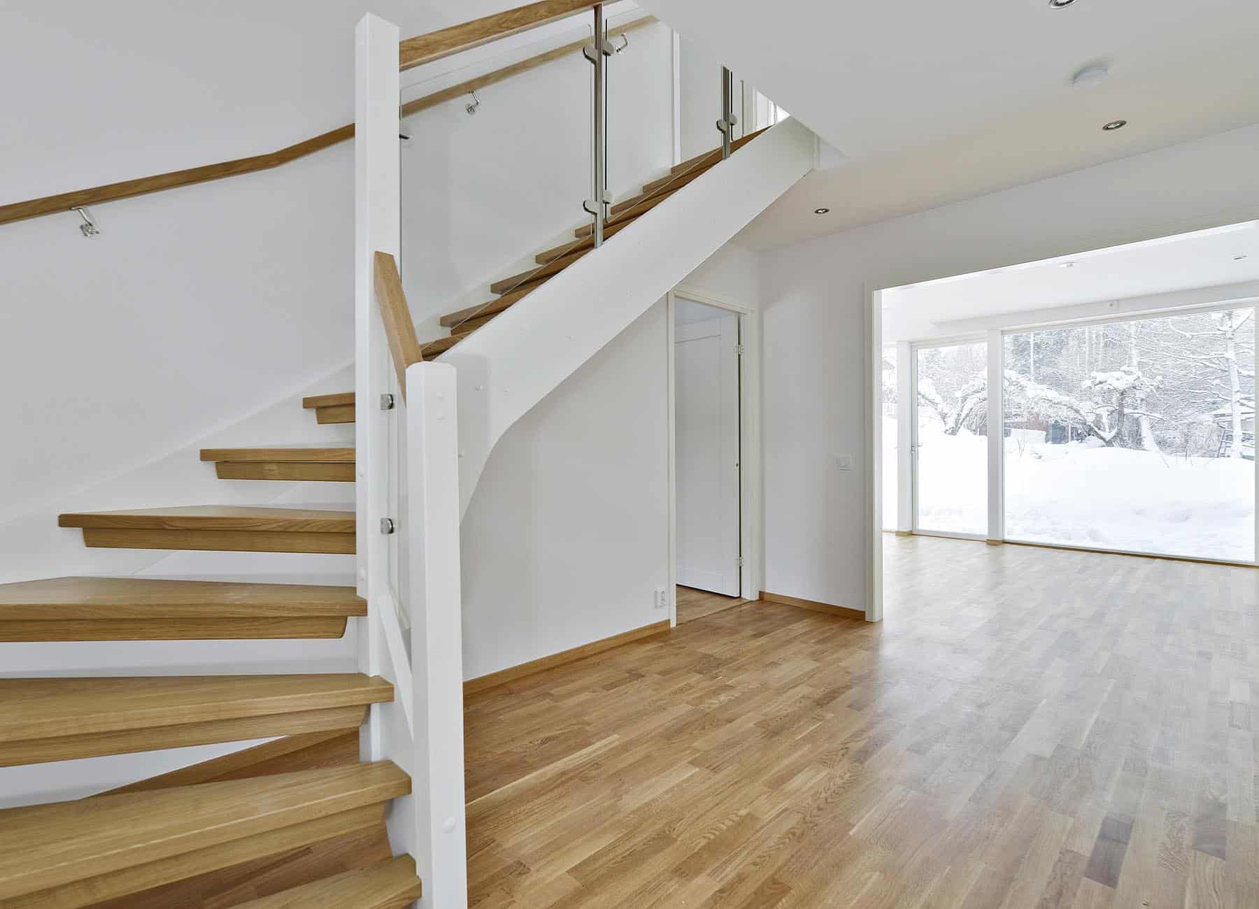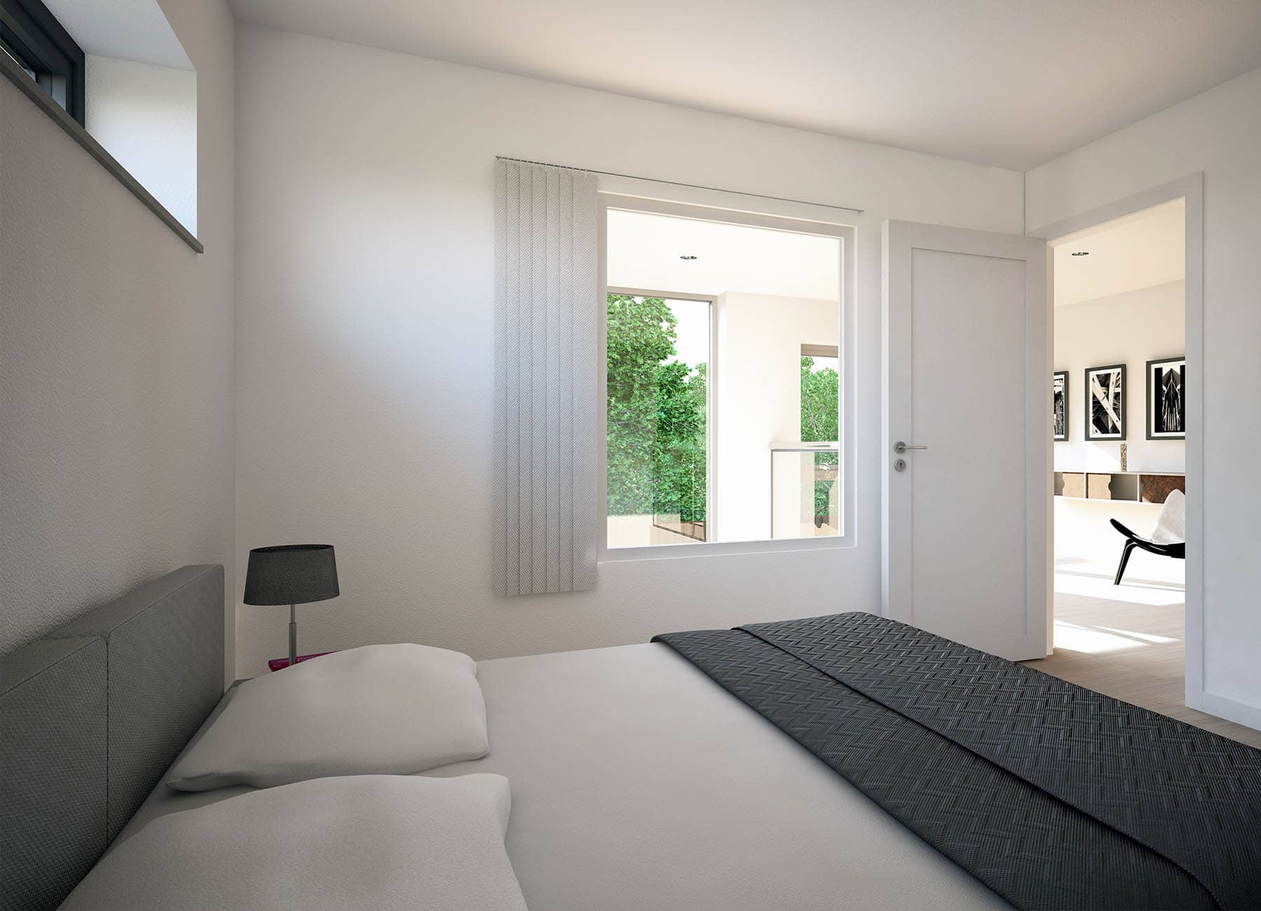 Huset har hela fyra sovrum, ett på nedervåningen och tre på övervåningen. Om man inte behöver så många sovrum passar två av de mindre sovrummen på övervåningen perfekt som hemmakontor med bra ljusinsläpp via stora fönster och gott om plats för både skrivbord och förvaring. I föräldrasovrummet på övervåningen finns det möjlighet att sätta in ett fönster mot den öppna delen från vardagsrummet nedanför som har öppet helt till taket på våning två.