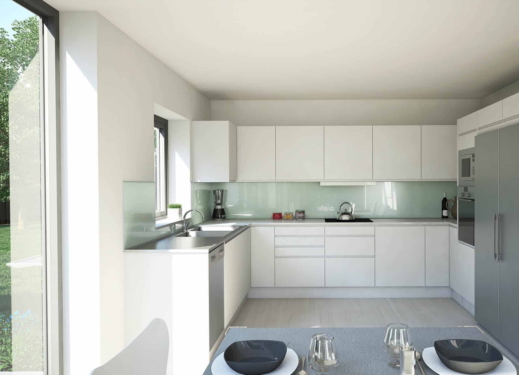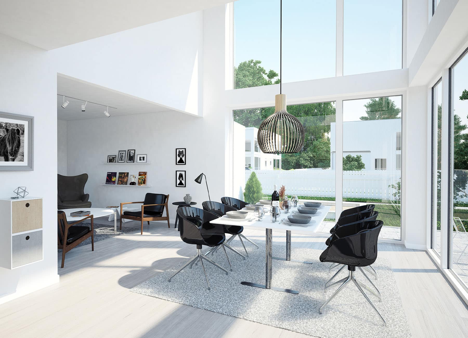Köket och vardagsrummet badar i ljus från de stora glaspartierna från golvet upp till yttertaket och de båda umgängesytorna knyts ihop genom den öppna takytan.